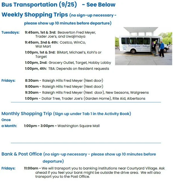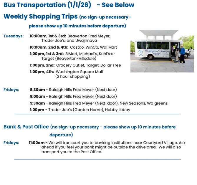 Please contact Michele Willemse, our Life Enrichment Director, at 503-297-5500 or michelew@courtyardvillage.com if you have questions or need clarification.